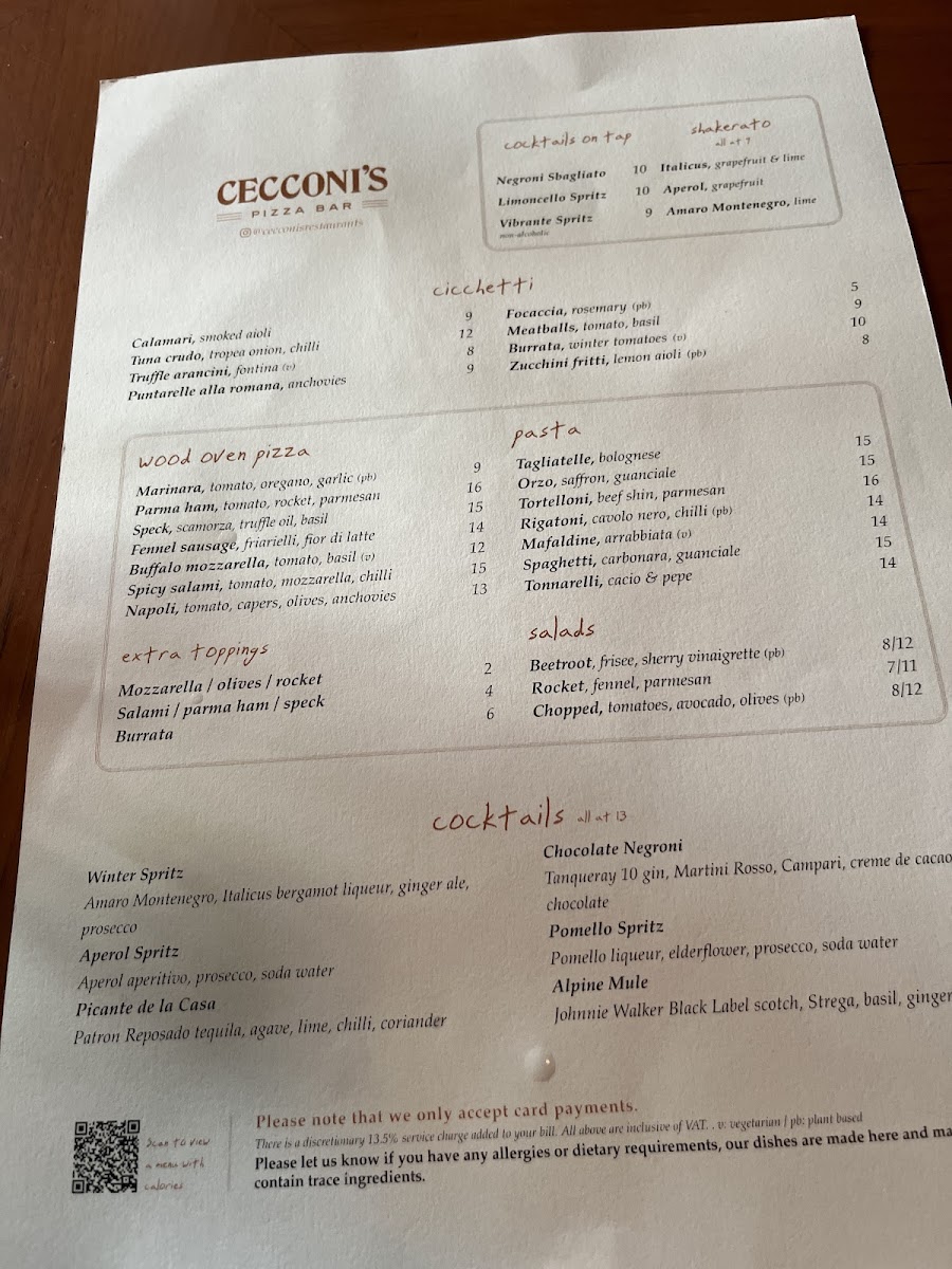 Cecconi's Pizza Bar, located at 19-21 Old Compton St, London W1D 5JJ, offers a vibrant dining experience in the heart of Soho, perfect for pizza lovers and those seeking a lively atmosphere. The Cecconi's Pizza Bar Menu stands out with its exceptional variety of wood-fired pizzas, each crafted with high-quality ingredients and traditional Italian techniques.